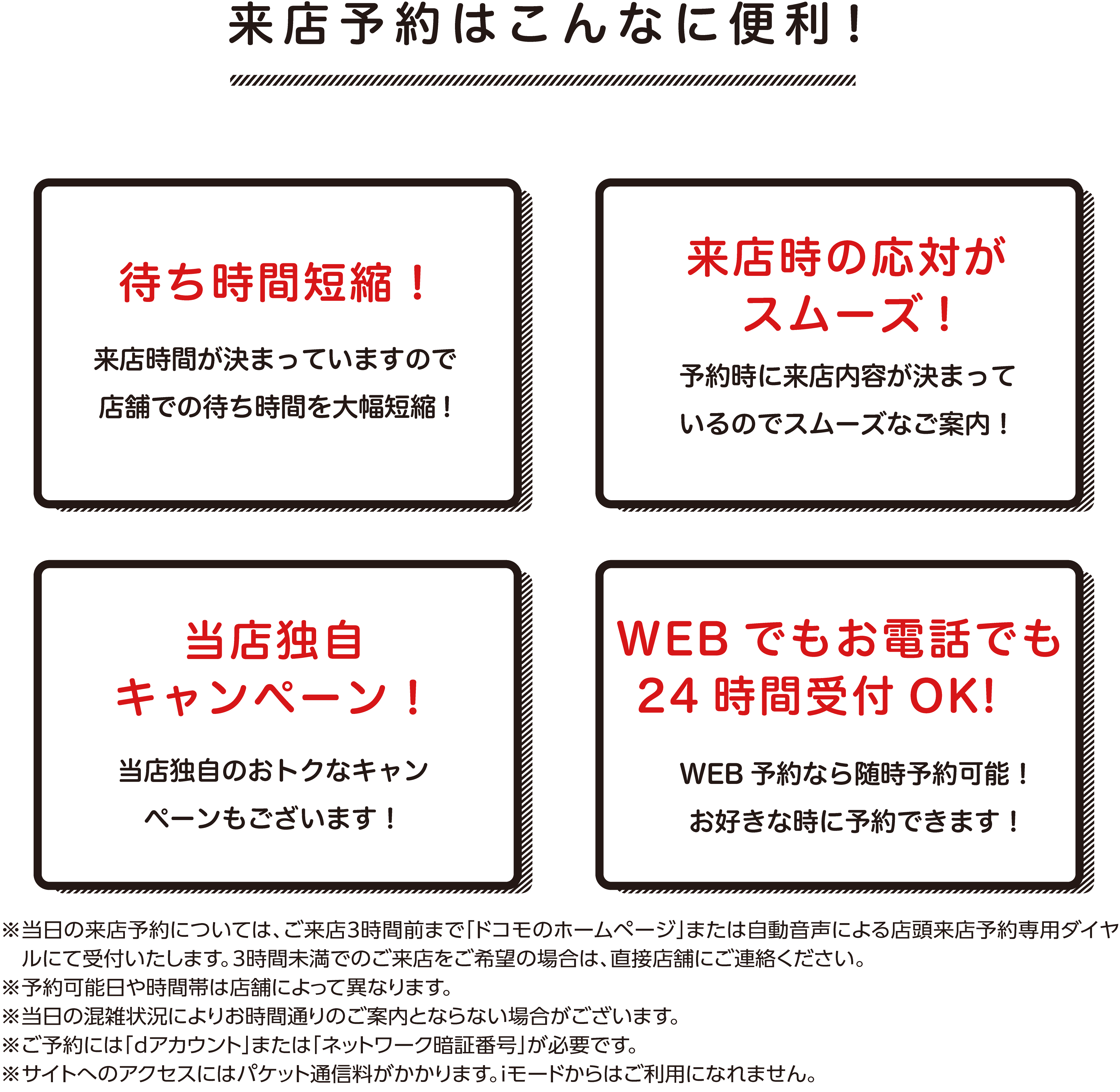 WEBからの来店予約には「dアカウント」が必要になります。 dアカウントが不明な方はお電話でご予約下さい!